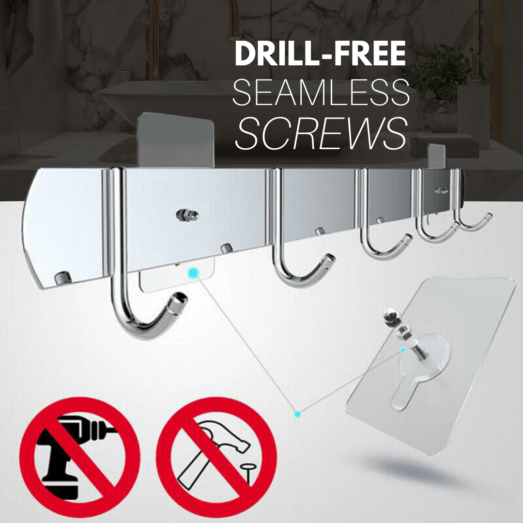 No more drilling on your wall! Our Drill Free - Seamless Screws will make you forget about nails or tacky glue marks. It holds strongly and can be removed cleanly without a trace. Just peel off the protective film on the hooks' back, stick the hook and then screw in the stainless steel hooks by hand!