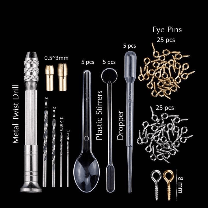 - mold kit - a metal twist drill makes you bore a hole easily, plastic stirrers to help you stir the glue and plastic droppers to help you extract liquid