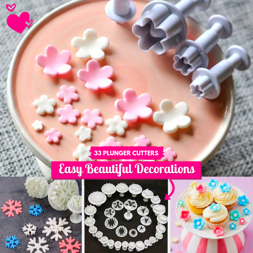Bake & Decorate Plunger Cutters is set of 33 differently shaped plunger cutters. Using this set you can create different decorations for your cakes like Heart, Veined Butterfly, Star, Veined Rose Leaf, Carnation, Blossom, Flower, Sunflower, etc. It is recommended for your sugarcraft cake decorations.