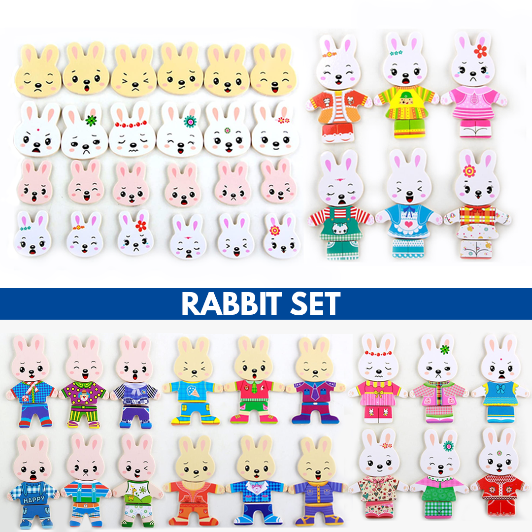 - family puzzle - the puzzle box is divided into four parts for four bears or rabbits, mainly the (mom, dad, brother, sister) have 6 suits of clothes and 6 different expressions, can be arranged to make many different bear/rabbit clothes dress-up